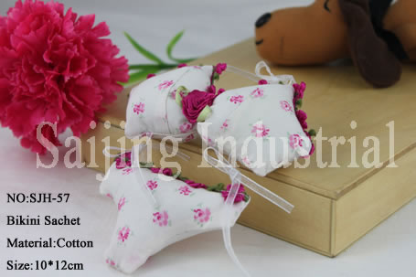 As an expert in producing aroma products, Shanghai Saiing Industrial Co., Ltd. provides you with high quality products and best service. Saijing is engaged in various sachets, such as strawberry sachets, slipper shape sachets and bikini sachets, etc. Among these sachets, bikini sachets can be a big surprise for you. With its bikini shape and floral print, this scented sachet stands out. Put it anywhere, you will get multiple benefits—decorate your place, scent your room, keep your things from mildew and moths, etc. And as a special present, a set of SJH-57 bikini sachet would be a big surprise for the receiver.